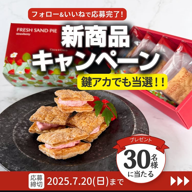 本物のいちごの味がする「FRESH SAND PIE (フレッシュサンドパイ)(4個入り)」、の販売を記念して、インスタグラムのCoco≠Coco(ココココ)公式アカウントをフォローしていただき、該当の投稿に「いいね!」をしていただいた方から抽選30名様に、「FRESH SAND PIE (フレッシュサンドパイ)(4個入り)」をプレゼントいたします。